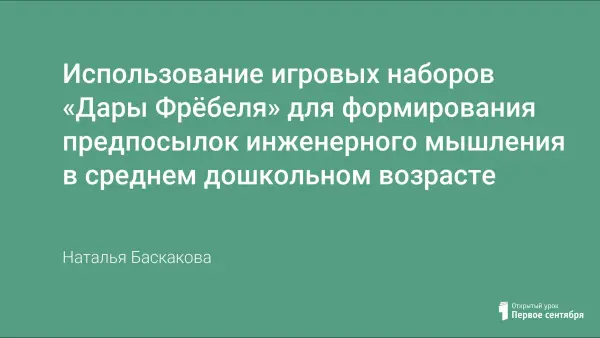 Дошкольное образование ставит перед собой цель – сформировать инженерное мышление у ребенка. А именно, воспитать человека творческого, с креативным мышлением, способным ориентироваться в мире высокой технической оснащенности и умеющим самостоятельно создавать новые технические формы. В практике работы с детьми средней группы использую игровые наборы «Дары Фребеля».