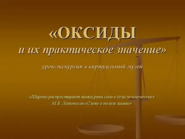 Форма проведения урока – экскурсия в виртуальный музей. Интеграция химии, биологии, географии, русского языка, математики, экологии, ОБЖ, ИЗО. Цель: систематизировать и обобщить знания учащихся об оксидах как самостоятельном классе неорганических соединений; закрепить умение в составлении формул бинарных соединений и их название; знакомство с классификацией оксидов; формировать представление о биологическом значении оксидов в природе.