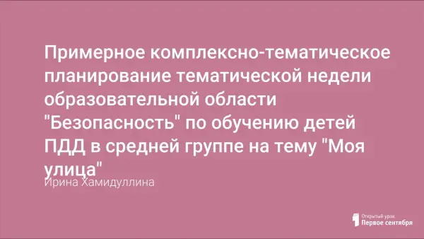 Предложенный материал содержит комплексно-тематическое планирование тематической недели образовательной области «Безопасность» по обучению детей правилам дорожного движения в средней группе на тему: «Моя улица» и может использоваться воспитателями при планировании работы по обучению дошкольников безопасному поведению на дорогах.