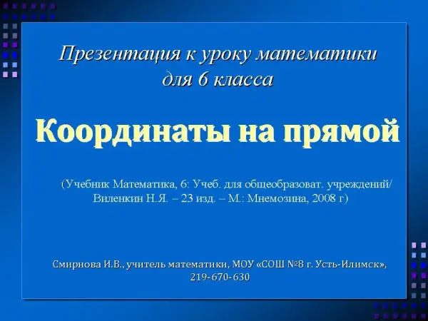 На уроке используется дифференцированный подход, учитываются психологические особенности учащихся – тип мышления. Цель урока: формирование основ функциональной линии введением понятия «координатная прямая»; учить находить координаты прямой и строить точки по заданным координатам.