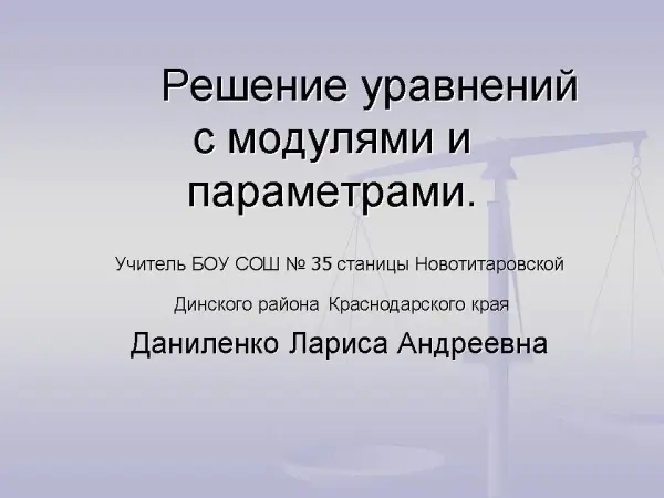 Урок алгебры учит решать некоторые виды уравнений с модулями и параметрами. Развивает речь, логику, воспитывает самостоятельность и умение преодолевать трудности.