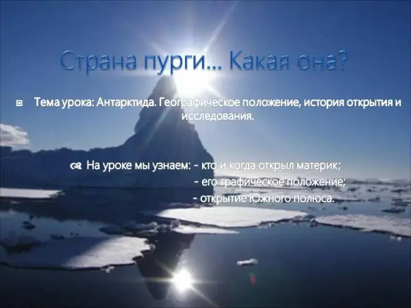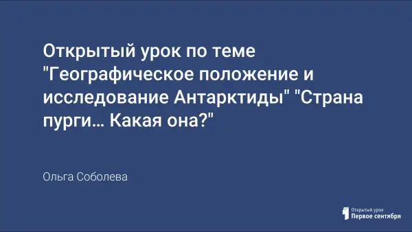 На уроке географии материков и океанов учащиеся характеризуют географическое положение Антарктиды, знакомятся с историей ее открытия, расширияют кругозор, работая с различными источниками информации, совершенствуют умение работать с географическими картами. Компьютерная презентация делает урок увлекательным, повышает мотивацию к изучению нового материала.