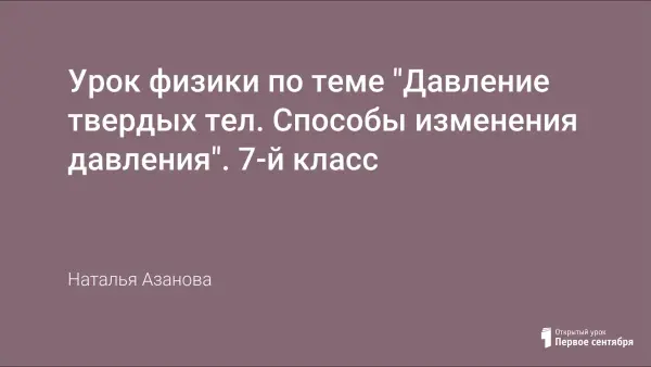 На уроке объясняется понятие давления, единицы измерения давления, формула для вычисления и способы изменения давления; вводится понятие силы давления. Урок формирует умения рассчитывать давление твердых тел аналитически и практически, учит применять знания в жизни. Урок способствует формированию культуры умственного труда, культуры межличностного общения через организацию работы в группах и публичного выступления.