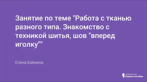 Занятие формирует навыки шитья способом "вперед иголку". Посвящено истории вышивки на Руси, швам, применяемым в вышивке, выбору ниток и атласных лент, подбору тканей для шитья, оформлению краев салфетки мережкой или бахромой, технике безопасности при работе с инструментами, изготовлению декоративной салфетки и скатерти способом шитья "вперед иголку" нитками мулине или атласными лентами и оформлению краев ткани.