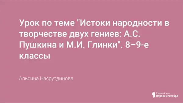 Разработку урока можно использовать на уроках искусства в 8-х, 9-х классах, на литературе, интегрировав его с музыкой, в 7-м классе. Цель: расширить познания учащихся о Пушкине и Глинке, создавших новый русский язык в поэзии и музыке; рассмотреть влияние народных традиций на формирование их самобытного творчества; познакомить с художественно-поэтическими и музыкальными произведениями, показать значение их творчества.