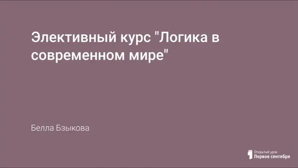 Программа элективного курса для учащихся 9-го класса рассчитана на 18 часов. Включает в себя темы: "Формы чувственного познания", "Понятие", "Суждение", "Запись суждений в виде формул", "Законы правильного мышления", "Дедуктивное умозаключение", "Символическая логика", "Индуктивное умозаключение". Уроки проходят на примерах и в игровой форме.
