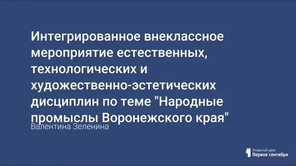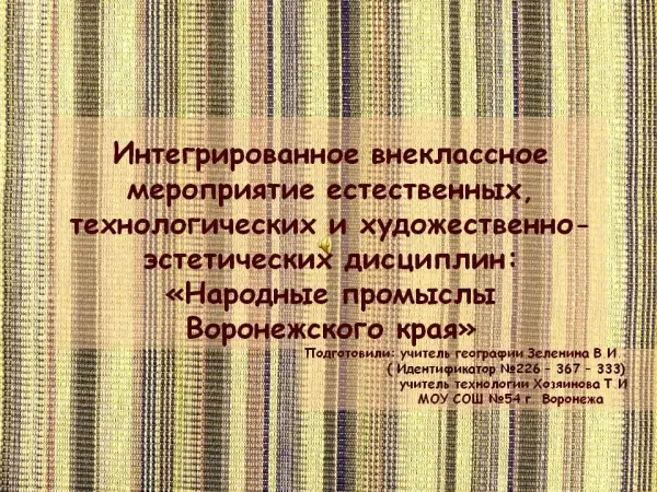 Материал мероприятия может применяться в качестве методического пособия на уроках географии, технологии и ИЗО. Цель: сформировать представление о культурных традициях и обычаях населения Воронежской области, расширить знания об основных занятиях наших земляков в прошлом; формировать эмоциональный отклик на значение народных промыслов в утверждении общественных идеалов; воспитывать любовь к традициям русского народа.