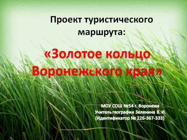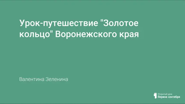Материал рекомендован при изучении материала по родному краю в 6, 8, 9-х классах на уроках географии или при проведении внеклассных мероприятий. Цель: совершить заочную экскурсию по «Золотому кольцу» Воронежского края; познакомить учащихся с достопримечательными местами Воронежской области: памятниками архитектуры, древними поселениями, природными уголками; воспитывать любовь к малой родине, чувство гордости за свое отечество.