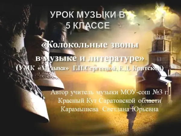 Урок музыки проводится в соответствии с требованиями ФГОС ООО (УМК Г.П. Сергеевой, Е.Д. Критской), раздел «Музыка и литература» 1-я четверть. Цель: сформировать практические навыки инструментального и вокального музицирования разных колокольных звонов в жанрах музыки и литературы. Урок сопровождается презентацинй с видео- и аудиофайлами, технологической картой, раздаточным материалом с текстом песни и графической схемой партитуры, информационным материалом.