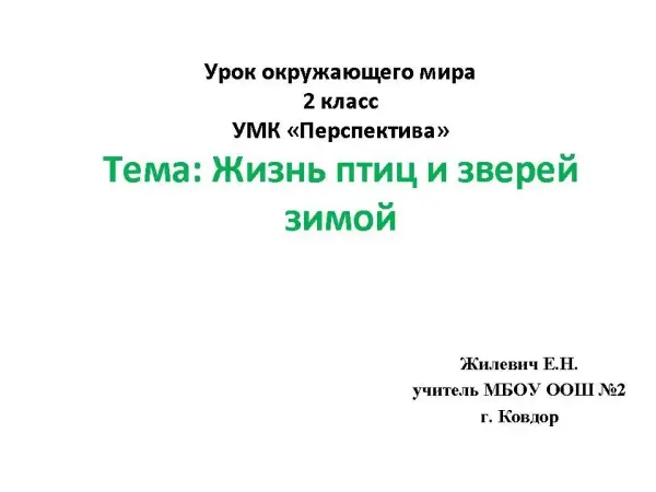 Цель урока: формирование представления о жизни животного мира в зимнее время. Урок соответствует требованиям ФГОС. На уроке предусматриваются следующие формы работы: фронтальная, индивидуальная, парная и групповая. В ходе урока используется наглядный и занимательный материал, дополнительная литература (книга «Зеленые страницы» Плешакова А.).