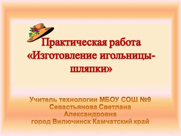 Урок знакомит учащихся с историей игольниц, функциональными особенностями шляп. Ученицы сами определяют тему урока, формулируют цель. На уроке используется пошаговая слайдовая презентация, в которой шаг за шагом дается техника изготовления игольницы-шляпки. При изготовлении игольницы закрепляются ранее изученные ручные швы. Технологическая карта учит самостоятельной работе. В конце урока ученицы оценивают свою работу, проводится выставка изделий.