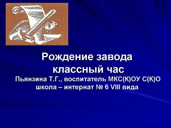 Классный час закрепляет знания детей об истории родного края, города, ведущего предприятия города – Гурьевского металлургического завода, воспитывает нравственно-патриотические качества учащихся. Рекомендуется воспитателям, классным руководителям, работающим в 6–7-х классах коррекционных школ VIII-го вида.