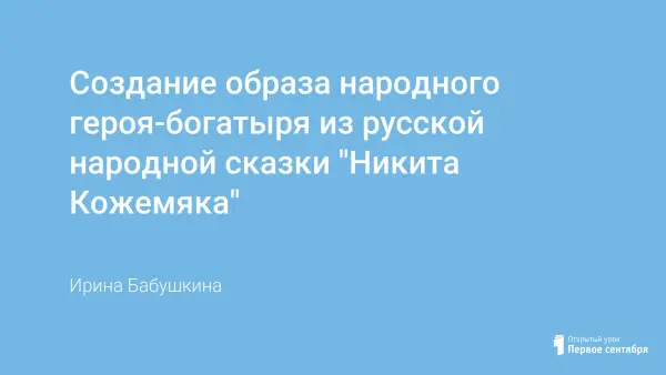 Занятие построено на просмотре мультфильма "Никита Кожемяка". Презентация включает произведения художников разных направлений, посвященные подвигу Никиты Кожемяки, составлена викторина "Никита Кожемяка", пошаговое изображение богатыря, подвижная игра "Никита Кожемяка". В занятие включена легенда о Никите Кожемяке, цветовая и орнаментальная символики древних славян. Можно использовать на уроках рисования в школе для детей 10–12 лет.