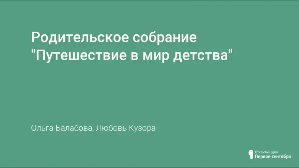 Родительское собрание построено как путешествие по страницам книги «Мир детства». Родители знакомятся с психологическими особенностями детей 2‒3 лет, получают информацию о роли общения и эмоционального контакта между родителями и детьми в период адаптации. Воспитатели предлагают вниманию родителей презентацию «Маленькая страна».