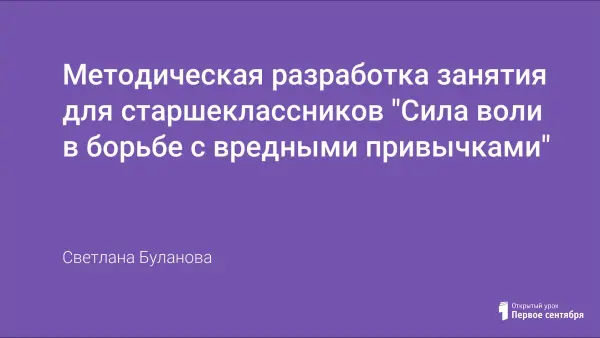 В статье представлена методическая разработка занятия для старшеклассников позволяющая расширить у обучающихся знания о негативном воздействии вредных привычек на организм человека, с рекомендациями, как использовать понятие «сила воли» в борьбе с курением, алкоголем, наркоманией. Форма занятия: психологическая беседа, тестирование и его анализ.