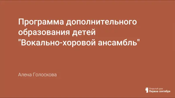Цель авторской программы: воспитание личности ребенка средствами хорового искусства; развитие музыкальных способностей детей; формирование эстетического вкуса; развитие музыкального слуха и голоса ребенка. Особое внимание уделено постановке голоса у детей с невыявленными или неяркими музыкальными и вокальными данными в обучении пению на хоровых занятиях.