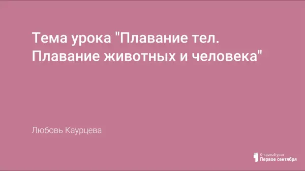 Цели урока: вывести условия плавания тел в жидкости; установить теоретически и экспериментально соотношение между плотностью тела и жидкости, необходимое для обеспечения условия плавания тел; закрепить понимание условий плавания тел; выяснить особенности плавания человека и животных.