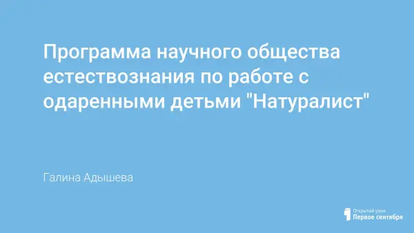 Программа работы с одаренными детьми (детьми, имеющими признаки одаренности) в общеобразовательной школе представлена в форме научного общества естествознания «Натуралист» по различным дисциплинам: природоведению, физике, химии, географии, биологии, астрономии. Программа утверждена методическим советом школы, входит в состав общешкольной работы с одарёнными детьми.