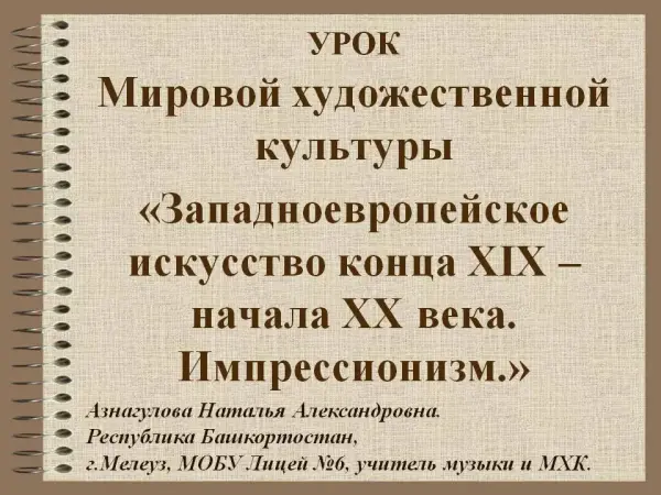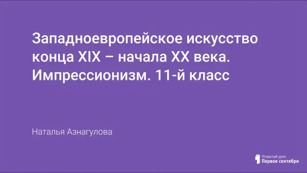 Урок МХК с системно выстроенным материалом, презентацией, которая знакомит учащихся с основными направлениями западноевропейской живописи конца XIX века, раскрывает особенности импрессионизма и постимпрессионизма.