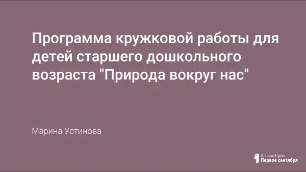 Кружковая работа в дошкольном образовательном учреждении – дополнительная образовательная услуга. Программа развивает творческие способности детей в конструировании из природного материала. В программе представлены условия, методы проведения занятий, учебно-тематический план работы кружка, результаты.