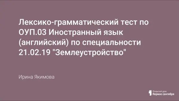 Тестирования на занятиях по иностранному языку дает возможность намного быстрее определить уровень усвоения учебной программы, значительно сократить время на проверку умений и навыков, приобретенных учащимися, выявить характерные ошибки и исправить. Представлен тест по английскому языку для студентов первого курса техникума.