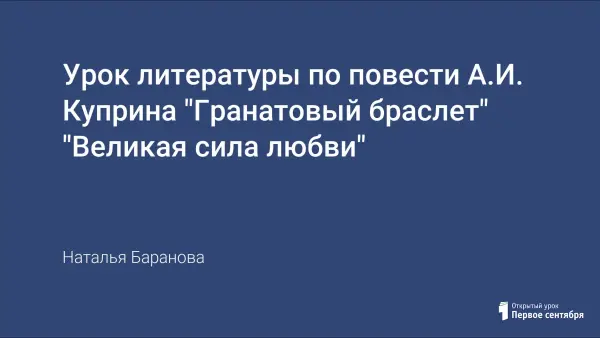 Цель урока: выявить своеобразие решения любовной темы в творчестве А.И. Куприна; расширить представления учащихся о художественном своеобразии прозы А.И. Куприна; познакомить учащихся с историей создания рассказа "Гранатовый браслет"; на основе непосредственных впечатлений от прочтения рассказа проанализировать произведение, рассмотрев проблематику рассказа, его сюжетно-композиционные особенности, своеобразие художественных образов.