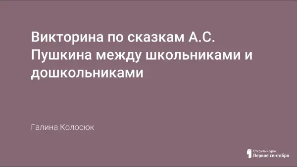 Викторина призвана развивать интерес к творчеству великого русского поэта, закрепить и уточнить полученные знания о сказках А.С. Пушкина, учить детей понимать красоту и силу русского языка, учить применять образные выражения, говорить красиво и правильно, формировать умение узнавать героев сказок по готовым моделям.