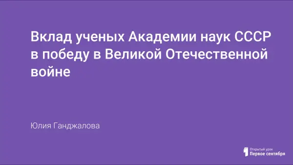 Урок посвящен вкладу ученых Академии наук СССР в великую Победу. Является интегрированным по предметам история и география и ставит целью не только систематизацию знаний, развитие умений делать выводы, прослеживать причинно - следственные связи, решать исторические задачи, но и воспитание патриотизма и чувства гордости за страну. Материал предназначен для учителей истории и географии, может быть использован на классных часах, школьных мероприятиях.