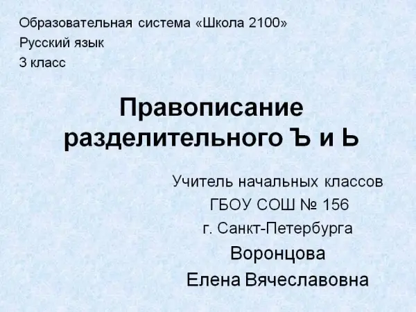 Урок русского языка ( Р.Н. Бунеев, Е.В. Бунеева, О.В. Пронина) по системе «Школа- 2100» развивает умения, орфографическую зоркость, речь, мышление, повторяет правилы употребления в словах разделительных "ъ и ь" знаков, создает комфортную, доброжелательную обстановку на уроке.