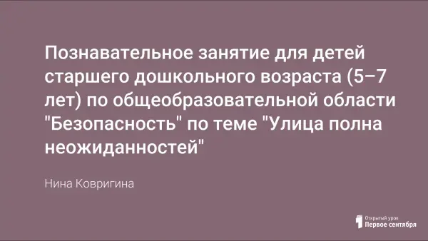 Цель познавательного занятия для детей старшего дошкольного возраста (5–7 лет): закрепление у детей старшего дошкольного возраста навыков безопасного поведения на улице. В игровой форме дети закрепляют знания о светофоре, дорожных знаках, правилах дорожного движения, правила поведения в автобусе; учатся применять полученные знания на практике.