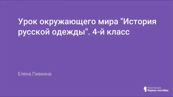 Цель урока: приобщать школьников к истории национальной культуры поисково-исследовательской деятельностью; познакомить с видами русской народной одежды: мужского и женского костюма Древней Руси; формировать представление о декоративно-прикладном искусстве русского народа; воспитывать в детях чувство гордости за свою родину и любви к традициям, культуре своего народа. Урок сопровождается презентацией.