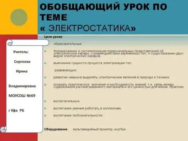 Воспроизведение материала, безусловно, ‒ необходимый этап повторения и контроля уровня знаний школьников. Оживить опрос, активизировать учащихся могут занимательные формы работы, например, урок-семинар с презентацией. Урок формирует представления учащихся о практическом значении электростатики в технике, экономике, повседневной жизни, об истории физики, о роли ученых-физиков в развитии мировой науки.