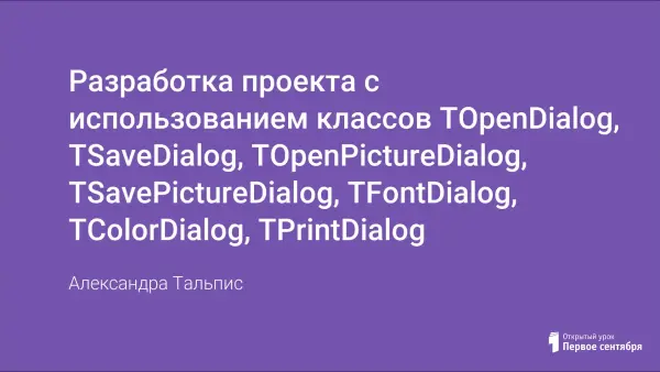 Заключительный урок по теме «Программное обеспечение при объектном подходе». Цель: формировать умения и навыки применения среды ООП для программного продукта с компонентами TOpenDialog, TSaveDialog, TOpenPictureDialog, TSavePictureDialog, TFontDialog, TColorDialog, TPrintDialog. Презентация содержит автоматическую анимацию, анимацию по щелчку, триггеры, а также интерактивные элементы и макросы.