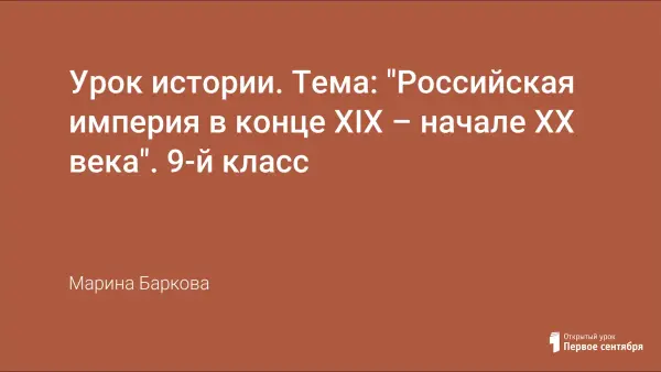 Первый урок в изучении курса "История России". На уроке даются общие сведения о Российской империи, протяженности ее территории, численности населения, его национальном и конфессиональном составе, государственной символике. Учащиеся закрепляют понятия "индустриальное общество", модернизация; анализируют изменения в социальной структуре России в связи с переходом на капиталистический путь развития и появлением новых классов – буржуазии и наемных рабочих. Занятие описывает проблемы, стоящие перед Россией.