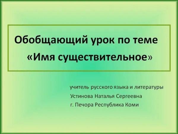 На уроке повторяются орфографические правила и теоретические сведения, изученные в теме «Имя существительное». Благодаря стихотворениям, загадкам, пословицам, поговоркам, фразеологизмам, предложениям с художественными обращениями развиваются навыки употребления имен существительных.