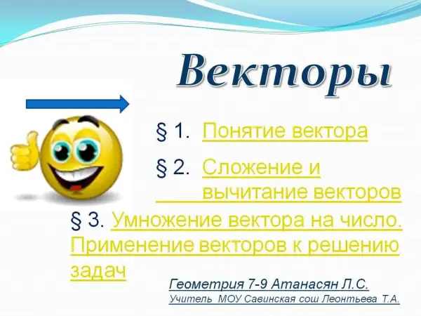 В презентации представлены три темы: понятие "вектор"; сложение и вычитание векторов; умножение вектора на число. Формы и способы работы с презентацией различны в зависимости от цели урока. Можно дать материал целым блоком в форме лекции или «кусочно», рассматривая поэтапно каждую тему. Урок использует первые шесть слайдов презентации, на последних двух слайдах – самостоятельная работа.
