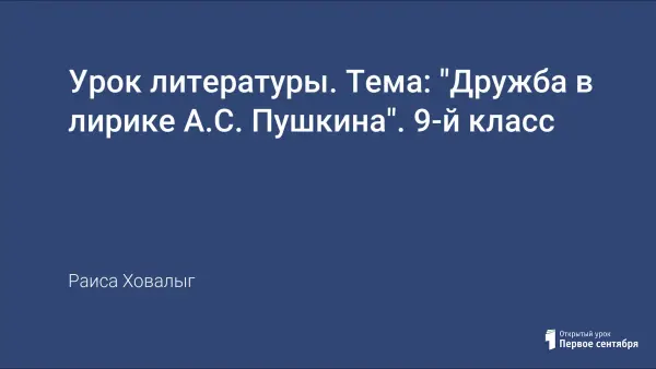 Цель урока: изучение творчества А.С. Пушкина. Познакомить учащихся с посланиями поэта, расширить представления школьников о личности А.С.Пушкина, совершенствовать навыки анализа поэтического текста, развивать образное мышление; воспитывать на примере жизни поэта умение дружить. В течение урока учащиеся должны почувствовать, понять, почему изучение "Дружбы в лирике А.С. Пушкина" так актуально сегодня. У них должен проявиться интерес к творчеству поэта.