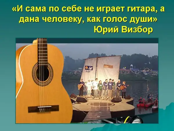 Урок знакомит учащихся с историей развития бардовского движения и рассказывает о следующих этапах развития самодеятельной песни: зарождение авторской песни (1930-е годы), развитие жанра в 50-е, 60‒70-е годы, тема Великой Отечественной войны, современная авторская песня.