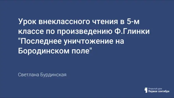 Урок по рассказу Ф.Глинки «Последнее уничтожение на Бородинском поле» помогает осознать, что любой человек имеет право на гуманное отношение не только при жизни, но и после смерти, показать силу любви человека к человеку, умение жертвовать и хранить память о любимом человеке, познакомить с публицистическим жанром.