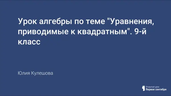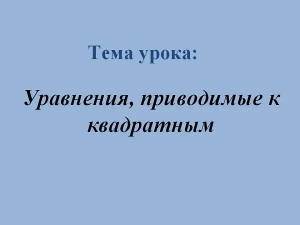 Урок алгебры в 9-м классе на повторение способов решения уравнений, приводимых к квадратным. Урок способствовует выработке навыка решения уравнений с помощью введения вспомогательной переменной, обеспечивает провку усвоения темы на базовом уровне, а также обучает умению работать с тестовыми заданиями.