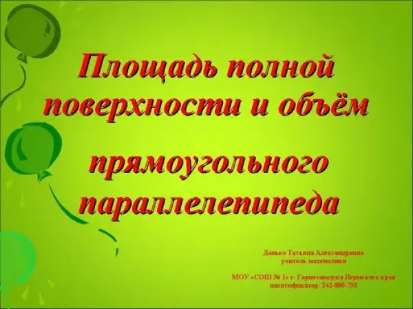 На уроке учащиеся знакомятся с геометрическим телом на примере прямоугольного параллелепипеда, дается понятие "объем", объясняются формулы нахождения объема прямоугольного параллелепипеда и куба. Учащиеся совершенствуют вычислительные навыки как в устном шифрованном задании, так и в задачах практического содержания. Знакомятся с историческими фактами развития математики, в частности с теоремой Эйлера.