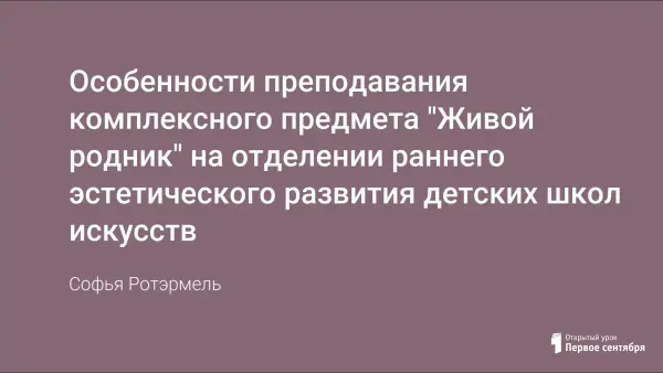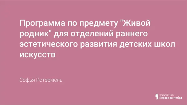 Комплексный системообразующий предмет «Живой родник» на отделении раннего эстетического развития ДШИ имеет ряд специфических особенностей преподавания, которые раскрывают предлагаемые методические рекомендации. Они учитывают возрастные психофизиологические особенности восприятия детей. Занятия по «Живому роднику», сочетающие интеллектуальное и творческое развитие, в наибольшей степени позволяют реализовать на ОРЭР формирование универсальных учебных действий (УУД) средствами искусства.