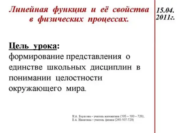 Урок рекомендуется провести в конце учебного года после изучения основного материала. Обобщает и систематизирует знания и умения по применению линейной функции в математике и физике, рассматривает взаимосвязь этих предметов при решении теоретических и практических задач. На уроке ученики защищают свои проекты.