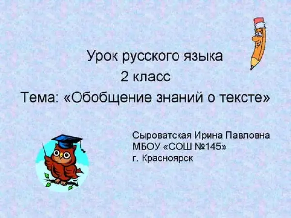 Урок русского языка во 2-м классе обобщает и систематизирует знания о тексте. В ходе урока ребята участвуют в составлении модели текста, которую они используют на уроке, а также на последующих уроках, в ней собраны основные понятия по теме "Текст".