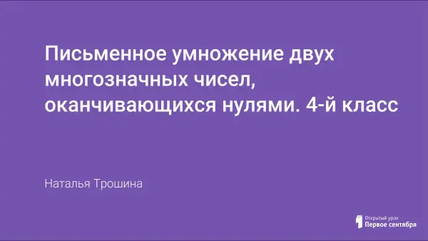 Цель урока - познакомить учащихся с письменными приёмами умножения двух многозначных чисел, оканчивающиеся нулями.