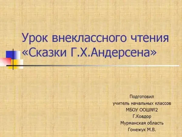 Цель урока: расширять представление учащихся о сказках Андерсена, учить выделять выразительные средства в произведении. Воспитывать у детей любовь к книге, чтению; расширять читательский кругозор; формировать осознанную систему представлений об окружающих людях, о себе, нравственно-этических нормах. Материал может использоваться во внеклассной работе.