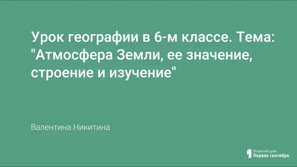 Цель урока – создание условий для формирования знания об атмосфере, её значении, строении и изучении. Выявляется роль атмосферы в жизни человека и планеты. Рассматривается состав атмосферы Земли. Учащиеся знакомятся с представлениями о методах изучения атмосферы используя визуальный ряд (презентация). Формируется экологическое мышление и этнокультурная компетентность, на примерах родной республики.