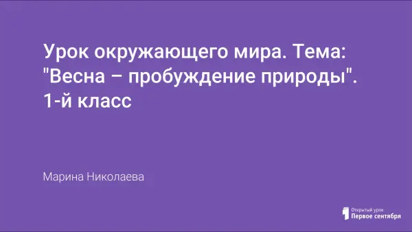 Урок проводится по программе «Школа-2100». Показано пробуждение природы, рассказано о характерных признаках весны в неживой природе и как они связаны с изменениями в живой природе. Дети повторяют названия весенних месяцев и узнают происхождение слов, усваивают понятие "перелетные птицы". Работая с динамической картиной, учащиеся сами создают картину наступления весны в неживой природе, как оно связано с изменениями в жизни растений и животных.