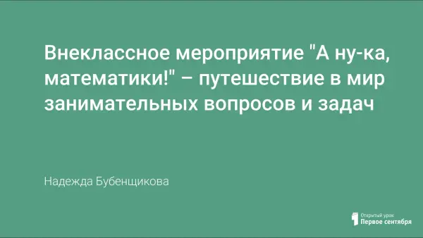 В представленном материале внеклассного мероприятия "А ну-ка, математики!" рассматриваются нестандартные задачи, способствующие привитию интереса учащихся к предмету, развитию логического мышления, воспитанию внимательности, аккуратности, дисциплинированности. В работе представлено описание этапов путешествия, включающих в себя различные задания по математике.