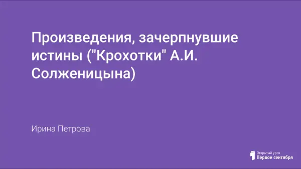 В ходе урока ученики участвуют в ролевой игре, в создании фильма-ассоциации. Учащиеся решают проблемные ситуации, раскрывающие жанровую, стилистическую и смысловую специфику произведений А.И. Солженицына «Крохотки». В результате анализа произведений А.И. Солженицына «Лиственница», «Лихое зелье», «Молния» учащиеся более подробно узнают о творческой манере писателя, об особенностях его мировоззрения.